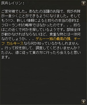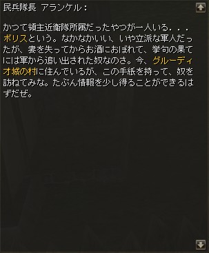 マルキアンワインを渡して、古い指令書をもらって、グルーディン港村から荒地へ。