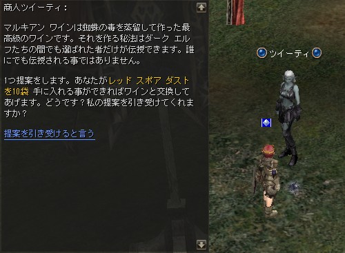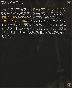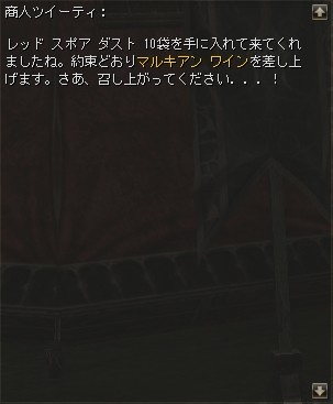 ツィーティの契約書レッドスポアダスト10個を渡して、マルキアンワインをもらって、