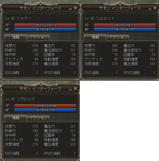 シャドーさんとシルエットさんとソウルレスさんと、それぞれステータス比べてみたけど