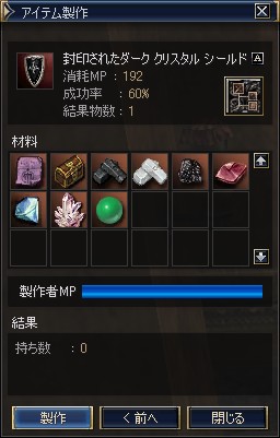 ダーククリスタルシールド(Aグレード)の材料が揃ってたので、先に盾を作ることに。